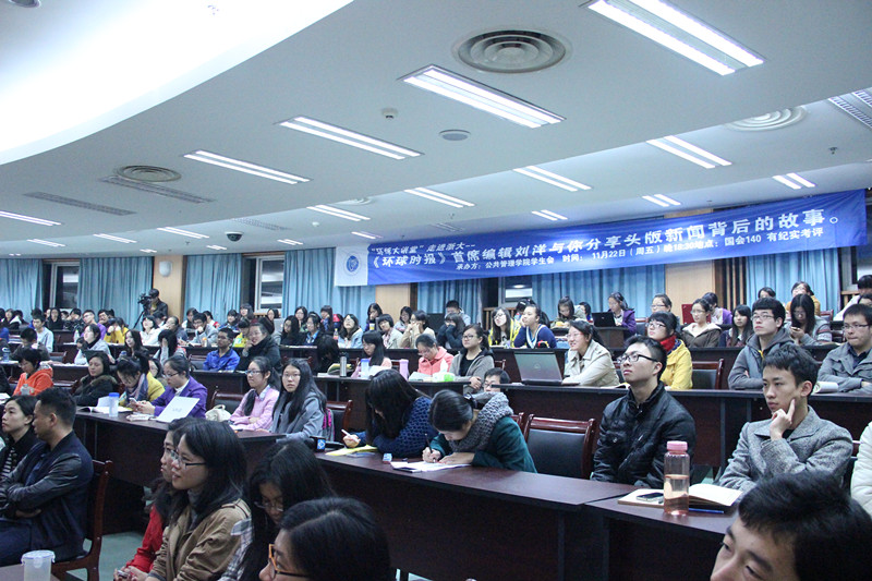 讲座开始之前,场内已经座无虚席。刘洋先生与我们分享了他从事新闻工作以来的见闻与感想。他向同学们讲述了《环球时报》自创办以来的发展历史,运用数个案例向我们讲述了他从事头版新闻操作的经历以及新闻头版头条背后所反映和隐藏的故事,而且更是用其风趣幽默的语言展现出一个个我们闻所未闻的世界角落,比如他讲到了在日本登上美国航母参观的故事以及和美国士兵讨论中美关系等,都让同学们十分感兴趣。