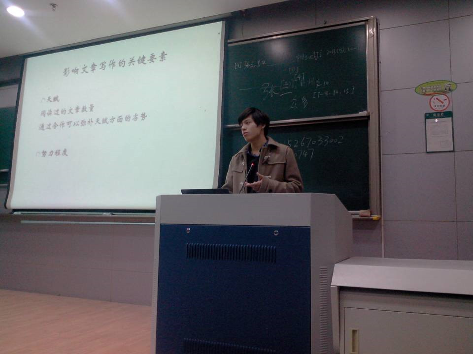 最后,便是在权威期刊和核心期刊上发表过文章的马辛旻学长讲述论文写作心得。马辛旻学长指出影响写作的关键因素为天赋和努力程度,阅历也是论文写作的一个十分重要的武器因为亲身经历能够获得书本中难以获得的知识和感悟。之后,马辛旻学长用图片展示了他去纽约做研究的经历。当展示到一张自由女神像的图片时,全场响起了一片掌声以表对大牛学长的赞叹。