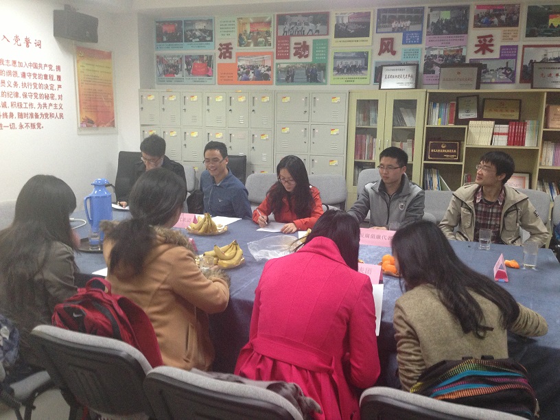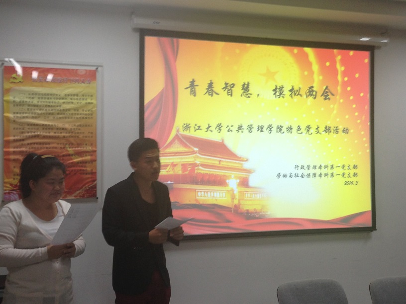 会议是由行政管理党支部书记李勇和劳动与社会保障党支部宣传委员曲达共同主持的。“新的一年,时光的车轮又留下了一道深深的印痕。转眼我们即将毕业,踏上一段新的旅途”,在这样一个特殊的时刻,我们开展这一活动,一方面是为了不同专业之间交流同一个问题的看法,同时也是一次深入观察社会问题的机会。当晚的活动以四个代表团的方式来轮流发表提案的形式展开,这四个代表团分别为:“喂人民服雾”代表团、夕阳红代表团、金饭碗代表团和反腐倡廉代表团,分别就当下中国社会的四大热点问题展开,即:环境雾霾问题、养老退休问题、大学生就业问题以及政府反腐问题,各位党员可自由选择感兴趣的主题代表团就坐。
