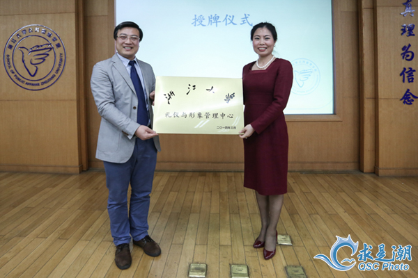 紧接着,邬部长代表学校为浙江大学礼仪与形象管理中心授牌,中心副主任包松老师接牌并合影。之后包松老师向大家介绍了浙江大学礼仪与形象管理中心的基本情况,也让大家对博雅修身培养计划有了更加深入的了解。