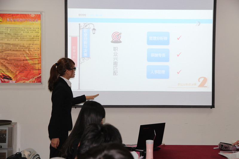 比赛第一环节是选手展示和评委提问。每位参赛选手都带来了他们精彩的职业生涯规划。肖青青同学以“理秋毫而及天地,析跬步以至千里”为题,展示了其向往成为一位管理分析师的美好愿景和严谨规划。何浩瀚同学志于成为一名优秀的个人理财规划师,其“礼”财的思想,体现了中华民族在对待金钱上难能可贵的价值观。吴雯雯同学的作品名称为“踏实前行,追寻平淡青春的无限可能”,她以严谨、踏实、肯干的精神,阐述了其职业生涯规划,并且强调了作为个人要对这个社会有所贡献。