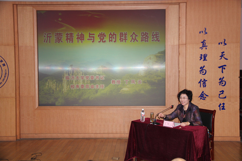 在介绍完丁凤云教授的经历之后,讲座正式开始。丁凤云教授着重介绍了沂蒙精神的内涵,她认为沂蒙精神的核心概括就是四句话:爱党爱军、开拓奋进、艰苦创业和无私奉献。“爱党爱军”是沂蒙精神的灵魂;“开拓奋进”是沂蒙精神的主题;“艰苦创业”是沂蒙人民的特殊品格;“无私奉献”是沂蒙精神的核心。这一内涵深刻体现了党的群众路线,体现了水乳交融、生死与共的党群关系。