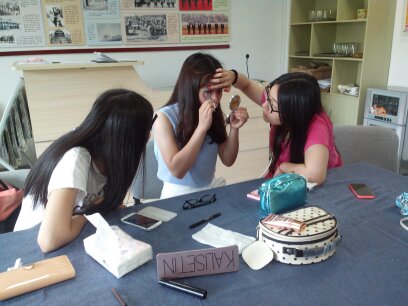 工作坊伊始,潘老师分别根据在场学员的个人特点,指出在化妆过程中需要注意的要点,并细致地为其中两名同学进行面对面的单独指导作为示范。在潘老师的细心帮助下,学员们拿出各自的化妆用具,认真而又仔细地对着镜子梳妆起来。期间潘老师不时地为遇到问题的学员答疑解惑,并亲自为同学上妆,同时对一些细节要领进行讲解。在工作坊结束前,各位学员还有些意犹未尽,希望能有更多的时间和机会学习与实践。