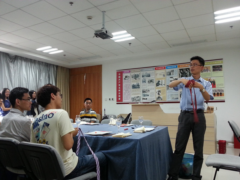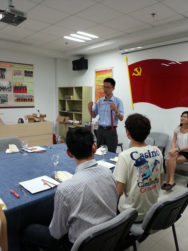 2014年6月6日午后12:30,由博雅修身礼仪与形象管理培训班主办的新一期礼仪培训之西餐礼仪和领带打法训练的工作坊在国会113教室开展。浙江大学公共管理学院辅导员卓亨逵老师和礼仪与形象管理辅导员工作室的车淼洁老师担任此次工作坊的主讲老师,本次博雅培训班的学员参加了此次活动。