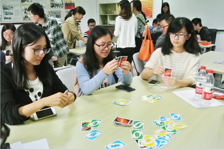 之后UNO比赛采取计分制,只要比赛中有一人胜出,其余玩家都要开始结算,手牌越多者积分越少。通过三轮比赛统计各个代表队所获取的总分数,再进行排名。