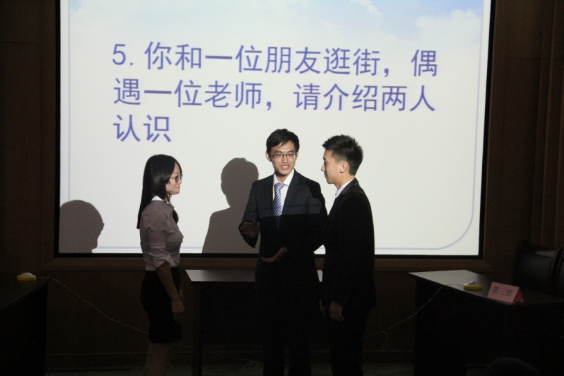 整场比赛分为风采展示和竞赛答题两个半场。上半场,风采展示环节分为“一路同行”、“初露锋芒”和“及时应对”三部分。“一路同行”中,各参赛队伍采取形式多样的表演风格,让评委和现场观众眼花缭乱、应接不暇;“初露锋芒”中,第四小组两位学员的双人舞,更是将正常活动推向高潮,赢得了经久不息的掌声;“及时应对”环节,选手们通过角色扮演、情景模拟,生动形象地把礼仪知识运用到接待宾客、相互介绍、参加会议等社会交际中。