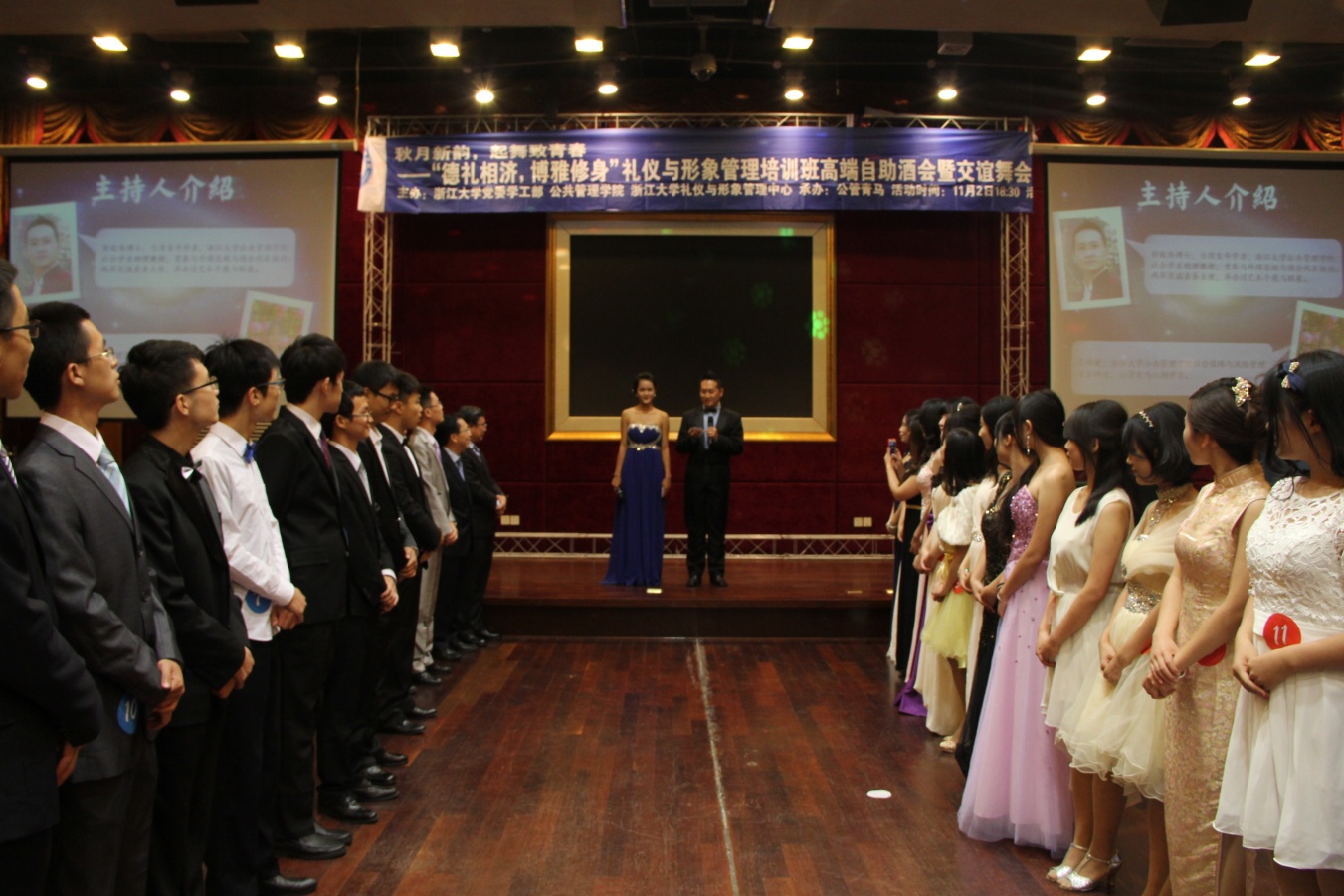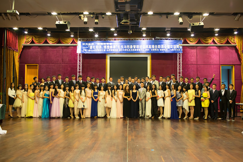 2014年11月2日晚,由浙江大学党委学生工作部、公共管理学院、礼仪与形象管理中心主办、浙江大学公共管理学院青年马克思主义者(学生骨干)培养学院承办的“德礼相济,博雅修身”礼仪与形象管理培训班高端自助酒会暨交谊舞会,于浙江大学科技园会议中心举行。本次活动吸引到培训班全体学员及其亲友团共计80余位同学盛装出席。出席本次活动的嘉宾有浙江大学党委学生工作部部长、礼仪与形象管理中心主任邬小撑老师,浙江大学公共管理学院党委书记、礼仪与形象管理中心顾问沈文华老师,浙江大学公共管理学院党委副书记、礼仪与形象管理中心副主任包松老师,浙江大学礼仪与形象管理中心讲师卓亨逵、陈超、闫小龙、车淼洁、韩永亮、潘临灵、苏腾老师。活动由公共管理学院社会学系郭俊伟博士、2012级本科生茶继媛主持,2013级本科生胡佳琦担任活动司仪。