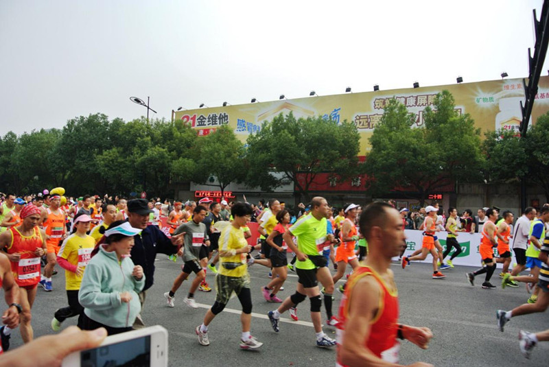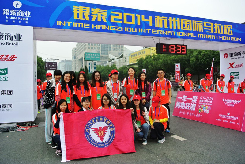 2014年11月2日星期天上午八点,伴着黄龙体育中心的一声鸣枪声,2014杭州国际马拉松竞赛正式开跑。由参加全程马拉松、半程马拉松、短程马拉松、小马拉松、情侣跑、家庭跑六个组别的包括来自国内外的三万余名参赛选手开始了各自的赛程,浙江大学公共管理学院15名同学作为志愿者对马拉松赛事全程守候。