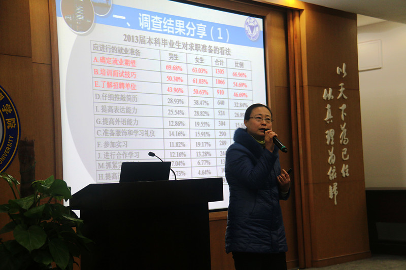谢红梅是学校就业指导与服务中心的资深老师,她今天为首先做了一个案例分享——周迅的“想想十年后的自己”,作为正题的引入。之后,谢老师展示了一系列关于大学本科生就业数据调查结果,主要包括毕业生对求职准备的看法、就业指导需求。谢老师通过对数据的解读,指出本科生应该以自我认知为基础,明确了本科生的优势在于学习能力和问题解决的能力;同时发现男生普遍认为自身表达沟通能力不高,与之相对,女生则认为自己领导能力缺乏;谢老师认为,女生在就业上表现得更为主动这一现象,源于招聘单位对女性潜在的“歧视”仍然存在,女生需要花费更多的努力去克服这一“不公”。在从大学生的角度分析完数据后,谢老师又引用美国关于雇主所需人才的素质和能力的数据,让大家了解到交流能力和诚实正直是最被看重的,而大学生普遍看重的绩点,其实并不是最重要的因素。