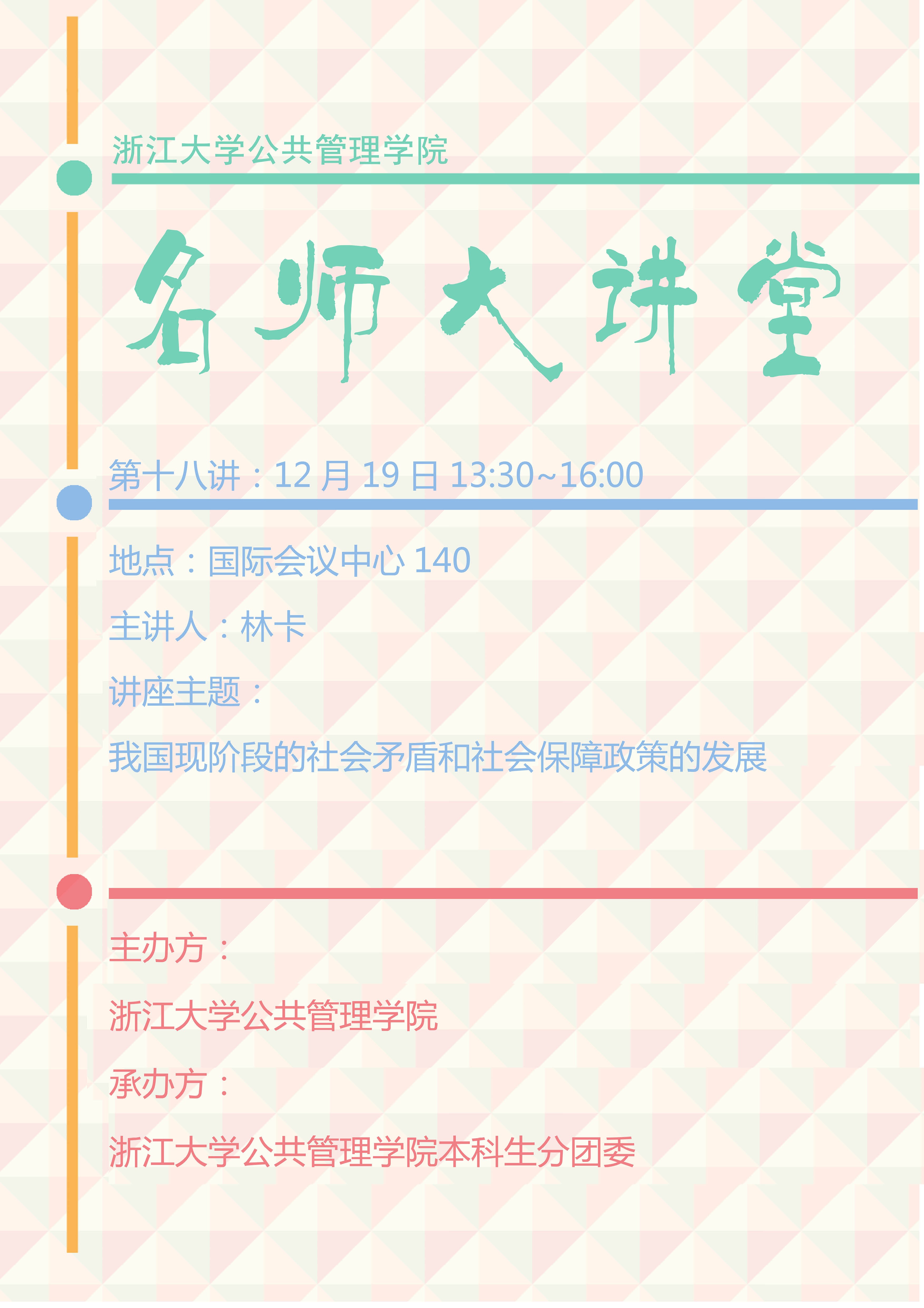 为增强学院学术氛围,让全校学生享受公管学院名师的资源,领略名师的风采,并指导同学们深入了解和解析当今社会热点问题,公共管理学院决定继续开办公共管理名师大讲堂第十七讲。本次讲座将由浙江大学林卡教授主讲,围绕我国现阶段的社会矛盾和社会保障政策的发展展开讨论。本次活动有纪实考评加分,欢迎各位同学踊跃参加。