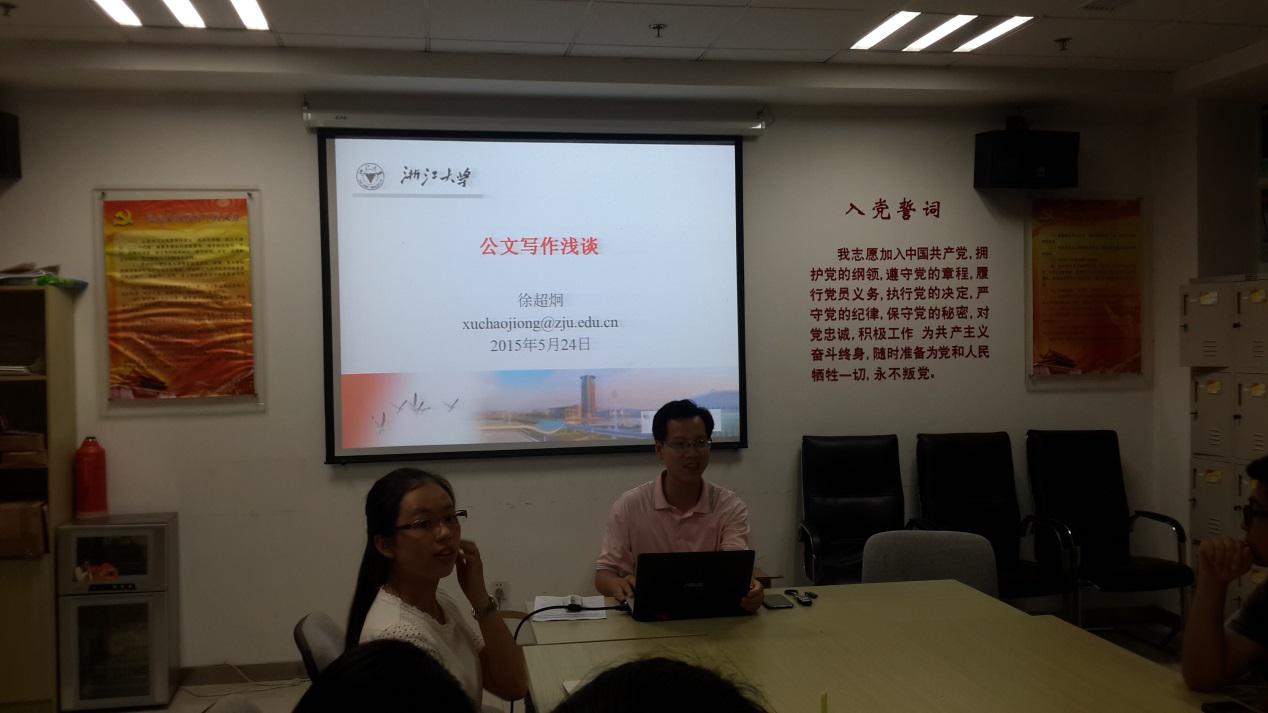 2015年6月14日晚上19:00,由浙江大学学工部现代写作中心开设的公文写作课程在紫金港校区蒙民伟楼113会议室如期开课,校党委组织部的徐超炯老师为到场学生骨干带来了一次细致深入的公文写作入门指导,大家均表示获益匪浅。