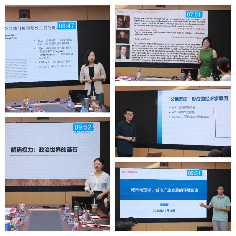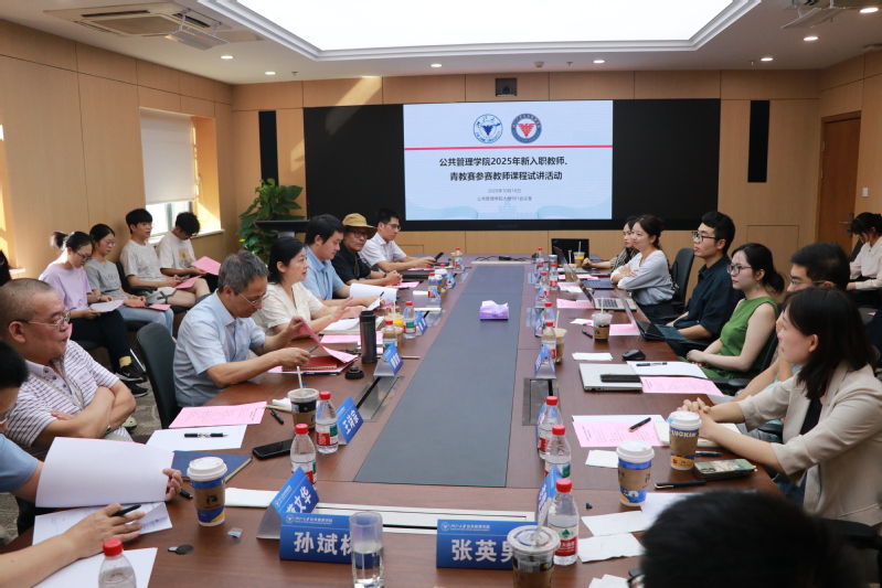 2025年10月10日下午,公共管理学院2025年新入职教师、青教赛参赛教师课程试讲活动在学院901会议室进行。党委书记颜鹂,副院长方恺,教师教学发展中心主任傅荣校,各专业资深教师代表赖金良、王诗宗、金少胜、蒋文华,特邀嘉宾求是特聘教授孙斌栋,学院往届青教赛优秀参赛代表张英男出席并担任点评人。各专业学生代表到场参与。活动由教师教学发展中心主任傅荣校教授主持。