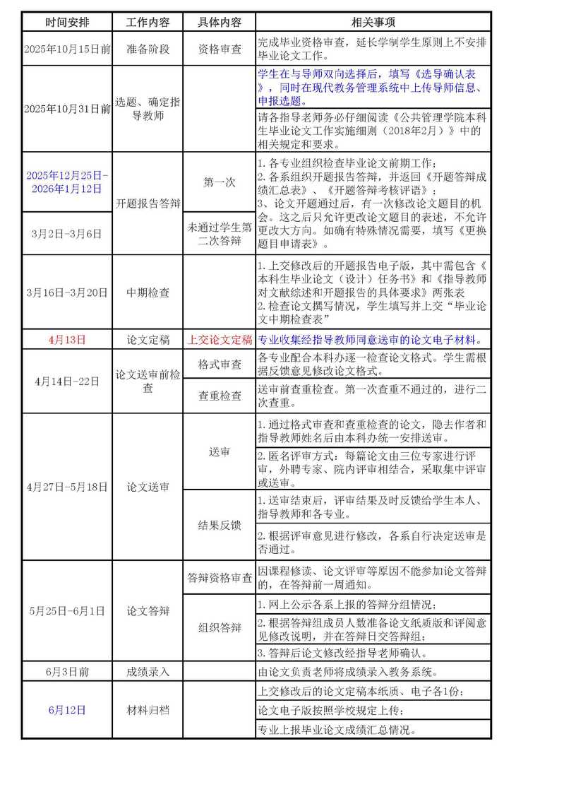 根据《浙江大学本科生毕业论文(设计)工作实施意见》(浙大本发[2018]3号,以下简称《实施意见》)、《公共管理学院本科生毕业论文工作实施细则(2018年2月)》(以下简称《实施细则》),特对我院2026届本科生毕业论文工作做出如下安排,请各系、各专业和2026届毕业生遵照执行。