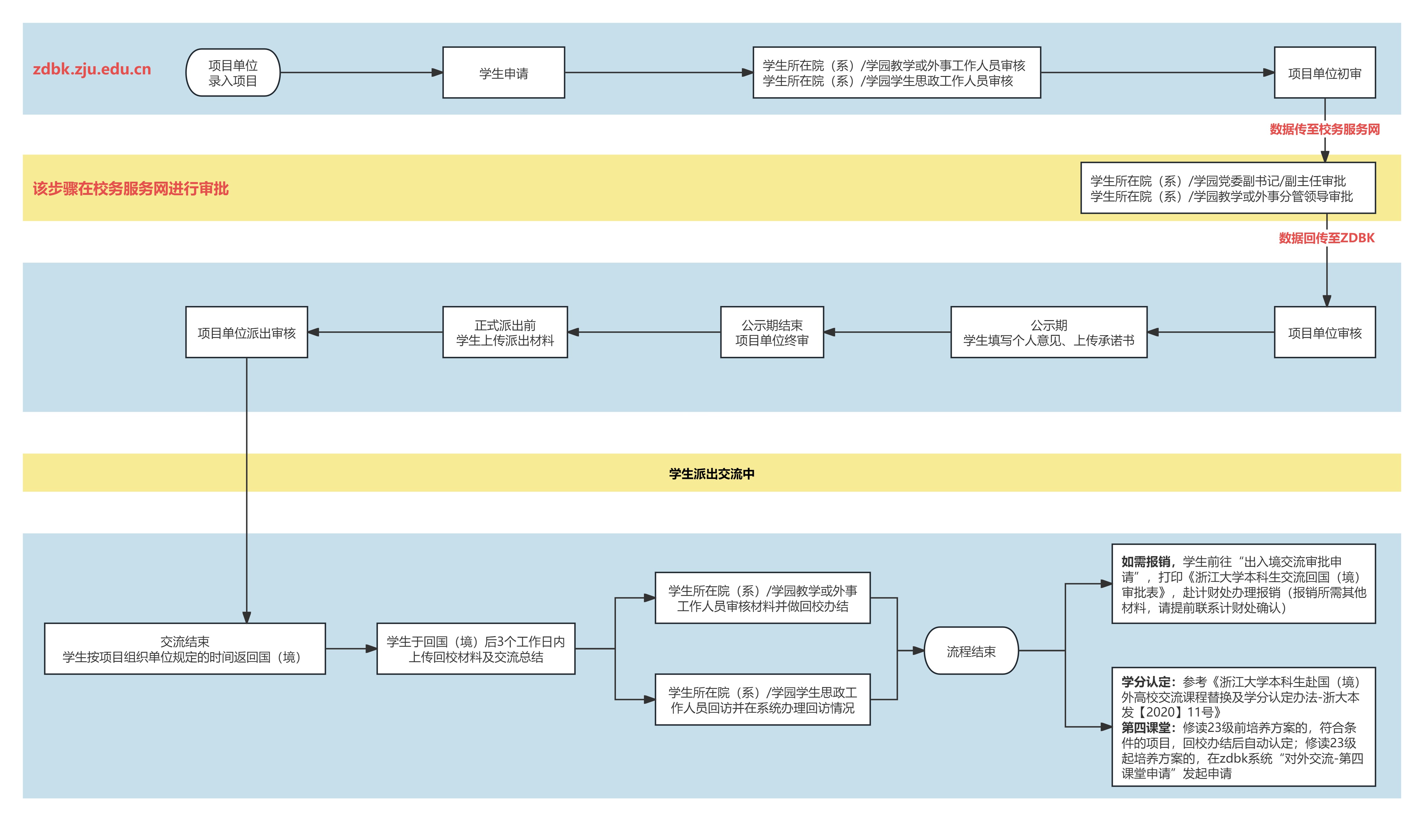 5. 若极个别国家签证要求派遣证明或事业单位法人证明须由单位法人签名并加盖学校公章,学生在本科教学管理信息服务平台(zdbk.zju.edu.cn)完成项目单位派出审核后,请联系学院(系)提交用校印申请。