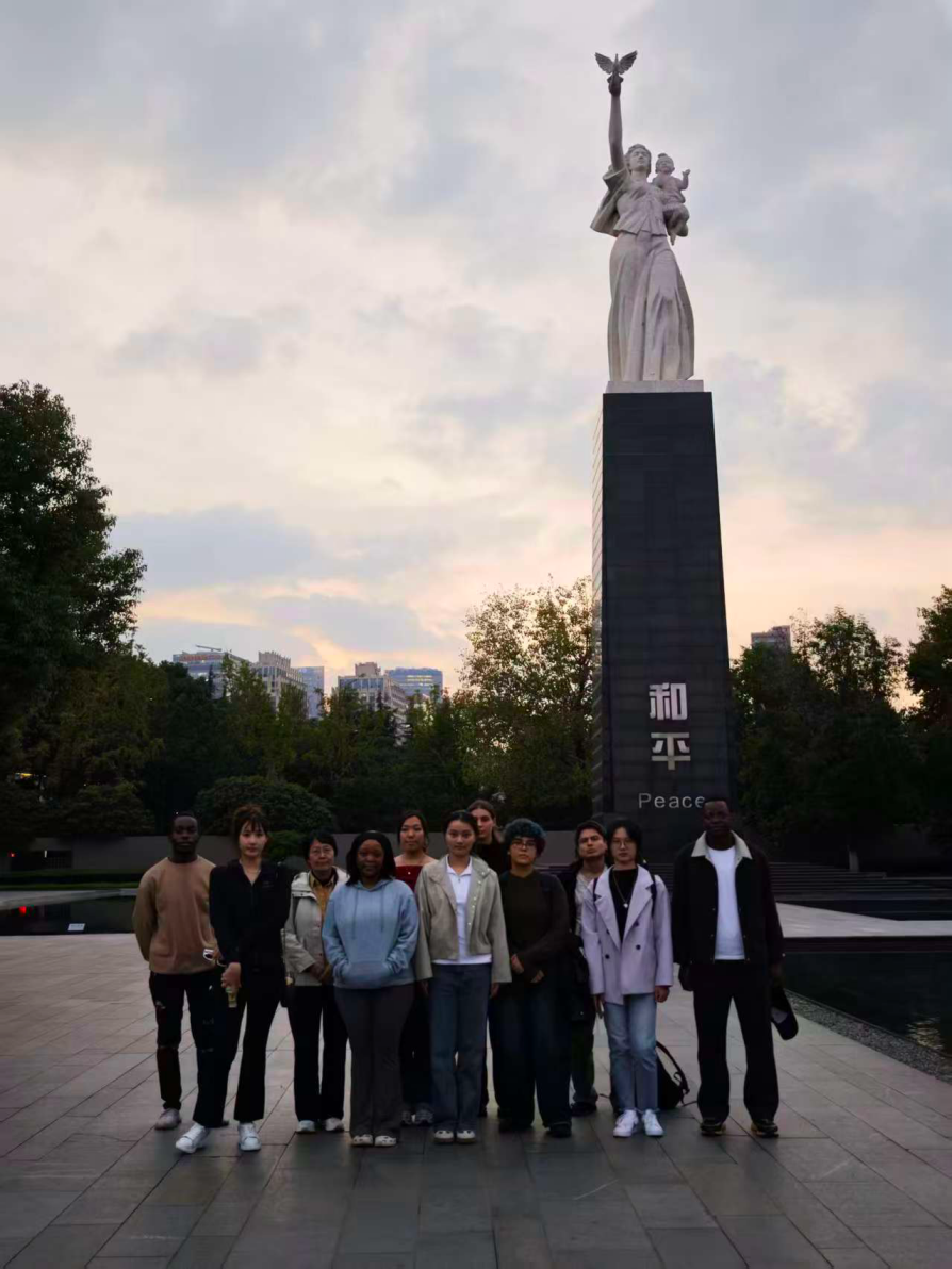 随后,调研团前往侵华日军南京大屠杀遇难同胞纪念馆。这是一次深刻的历史教育与心灵洗礼。大量翔实的档案文献、幸存者口述影像与实物证据,真实再现了那段惨痛的历史。不少同学动情地说,馆内的史实陈列让大家深刻感受到历史的沉重与和平的珍贵,出口处沐浴在夕阳下的“和平”雕塑更让同学坚信铭记历史是为了开创更美好的未来。同学们普遍认为,这段经历深化了大家对“铭记历史、珍爱和平”全球性议题的理解。