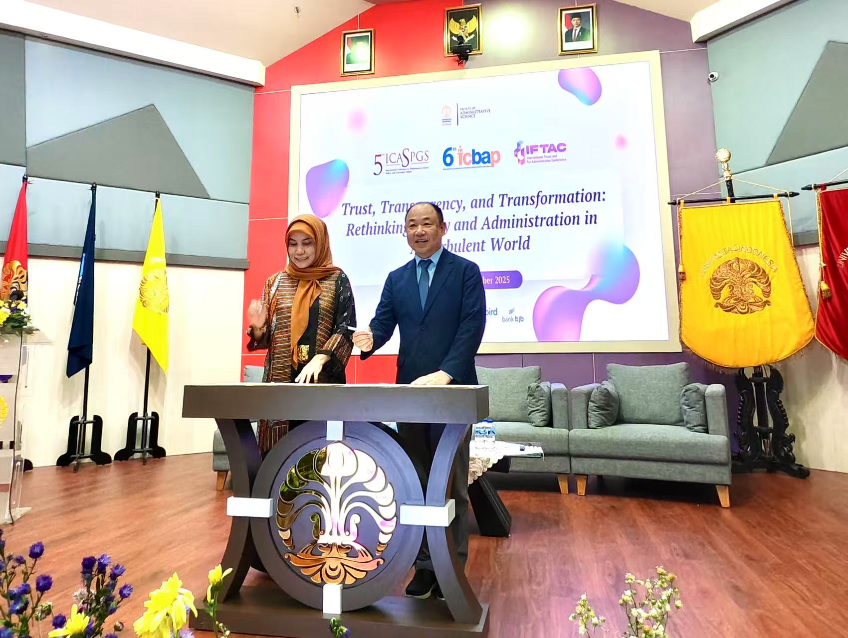 2025年11月25日-2025年11月29日,浙江大学公共管理学院院长赵志荣教授与亚欧研究中心主任沈伟教授出访印度尼西亚,出席第五届行政科学、政策与治理研究国际会议(ICASPGS)、第六届国际税务管理与政策学术会议(ICBAP)及国际财政与税收学术会议(IFTAC)联合大会,并且与印度尼西亚大学行政科学学院、迪肯大学-兰开斯特大学(印度尼西亚)、中国人民大学区域国别研究院南亚东南亚研究所和江西财经大学区域国别研究院在雅加达与万隆分别举办学术研讨会纪念中国-印尼建交75周年与万隆会议70周年。此行不仅实现了学院与印尼大学行政科学学院的合作意向书签约,更在学术交流、科研协作及本科生海外培养领域达成多项共识,为两校长期合作奠定坚实基础。
